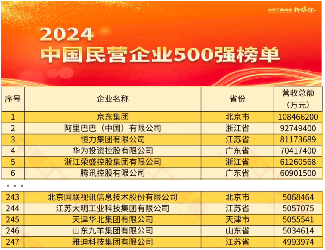 近日,全国工商联权势巨子发布“2024中国平易近营企业500强榜单”和“2024中国办事业平易近营企业100强榜单”。国联股份凭仗稳健成长的分析实力位列“2024中国平易近营企业500强榜单”第243位,排名上升60位,同时入选“2024中国办事业平易近营企业100强榜单”第54位,排名上升17位。