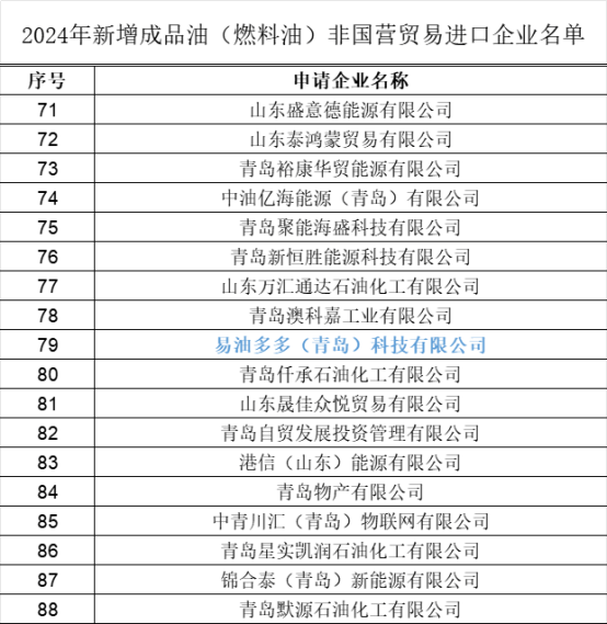 喜信!易油多多(青岛)科技无限公司 成功获批进入2024年新增成品油(燃料油)非国营商业进口配额企业名单?。